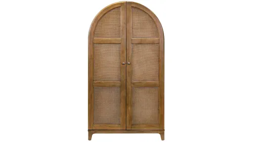 Quincey Cabinet is crafted of Mindi wood and woven rattan. At the heart of the collection is the wood slab table with its mortise and tenon style base and golden-brown finish that highlights the cathedral veneer. There is a matching bench, and shaped chairs featuring woven backs with linen fabric seats to incorporate the natural elements that add tropical charm and set the stage for memorable gatherings.