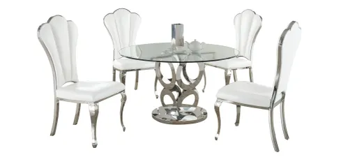 This Raegan dining set would make a great centerpiece to any contemporary dining room. Featuring a table with a laser-cut concentric ring pedestal base which presents a thoroughly modern profile. Plush, fabric upholstered dining chairs bring the set together.