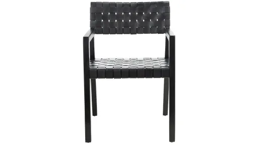 This utterly stylish Ravenel Dining Chair redefines modern minimalism for today's eclectic interiors. Its starkly angled black mahogany frame is given additional decorative depth in its matching black woven leather seat and back, making it a contemporary design icon.