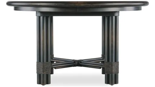 Retreat Pole Rattan Round Dining Table has a bundled-pole-designed motif with rope accents. Crafted of Oak Veneers, it features the Black Sand finish, transparent by design to reveal unique grain patterns of the veneer. The tabletop has a Solid Wood edge. When the 20-inch leaf is in place, the table extends to 74 inches and accommodates up to 8 coordinating chairs. Without the leaf, it accommodates up to 6 coordinating chairs.