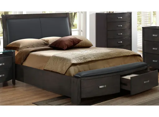 Taking the expected design elements of hard contemporary and putting a decidedly feminine curve into the mix make the Richardson queen storage bed, a unique addition to your new bedroom design. With each curve comes a new twist – satin nickel hardware accents the glossy finish, bowfront case pieces feature ball bearing drawer glides, and compliment the padded sleigh headboard and footboard.