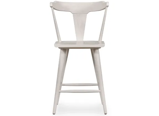 A fresh, counter-height take on mid-century Windsor seating, featuring a bowed, sculptural silhouette and off-white finish to highlight the natural grain of weathered oak.