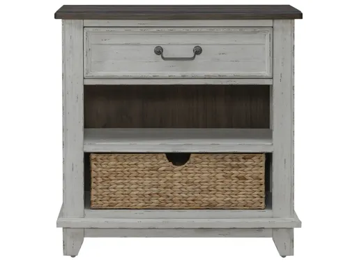 Create a room of your own that provides the perfect start and end to every day with the River Place Bedside Chest w/ Charging Station. Crafted with excellence using pine solids and veneers, this bedside chest features a heavily distressed two-tone Riverstone White with Tobacco top finish. There are two wood framed doors and one full extension drawer with soft closing drawer guides for an elegant touch. The drawer offers premium felt lining to protect your valuables. One adjustable shelf is located behind the two doors. The doors, framed end panels, and top feature a high-low veneer pattern for added dimension. Place the bedside chest next to your bed and take advantage of the built-in charging station complete with two AC outlets, one USB port and one USB-C fast charging port for all your electronic devices. Wide pilasters flow into angled block feet to complete the farmhouse styling with a timeworn feel that we all know and love. The custom Antique Pewter knob hardware accents the River Place bedside chest to help create an inviting, airy atmosphere in your home while providing comfort in your own private getaway.