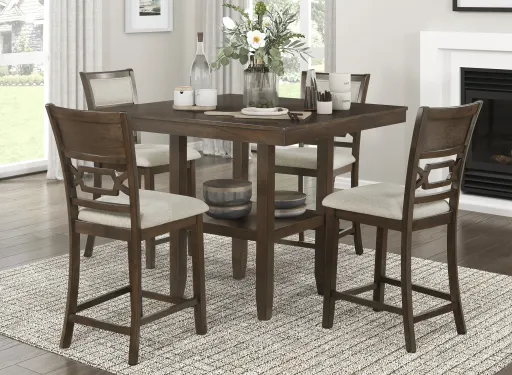 Rivera Counter-height 5-pc. Dining Set offers a casual dining option for your dining space. The counter height table features a square top and open shelf base for display of your favorite tabletop accessories. Mindy veneer covers the collection with its grain highlighted by a dark brown finish. Wood-framed counter height chairs feature a decorative back and beige textured fabric seating.