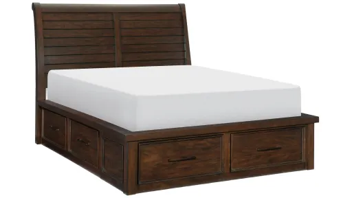 The transitional framing of the Rosemont Bed allows for versatile placement within a number of classic bedroom decors, making a perfect choice for your home. A brown finish is utilized over mango veneer for subtle highlighting of its distinct grain. A total of 6 drawer units are located on the side rails and footboard of the bed creating additional storage space within your bedroom. The sleigh headboard is paired with a platform footboard resulting in an unfettered design. Dark finished pull hardware front each drawer creating a complementing accent to the drawer fronts.