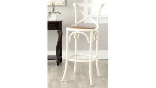 With its willowy frame and iconic cross back inspired by Michael Thonet's classic bistro chair, the Roxy bar stool by Safavieh is ideal in kitchen or great room. Crafted of solid American oak, including the X arch brace, this casual bar stool is finished in distressed ivory with a seat of rattan caning.