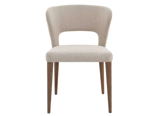 Embrace modern style and comfort wth this alluring side chair. A bucket-style seat with a unique open-back design is adorned in a timeless taupe fabric upholstery, and rests on artfully angled wooden legs in a warm brown finish. The combined look is inviting for all to gather round.
