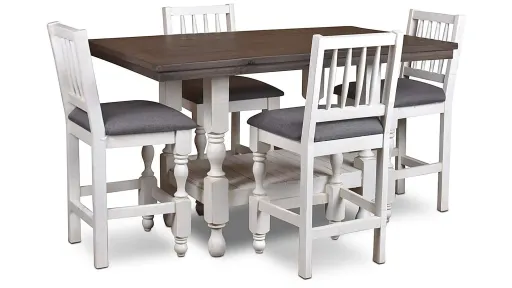 Enjoy luxury with a conscience, crafted with solid sustainable pine wood from renewable tree farms, the rectangle shaped Rustic French 60" Counter Height Table Set with Four Stools is beautiful for your home and the planet. Convenient authentic wood blanked storage shelf is oh so handy for your dining and entertaining needs. French rustic combined with Hamptons style, this quality dining room or kitchen furniture will add coastal living decor to your lake house, country chic cottage or high rise. Romantic antique white finish brightens your living space while the brown planked top and elegant turned ball feet will blend with your traditional decor. Thick balusters legs provide sturdy support with a contemporary vibe. Like the surf hitting the sand, have one room drift into the other.