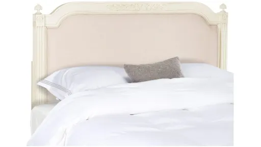 The luxuriant furnishings in the boudoir of a famous French actress inspired this Rustic Wood Upholstered Headboard. Finished in a fine antique beige, it's crafted using rustic oak wood to highlight its graceful linen upholstery. Delicate details create its heirloom style.