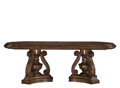 San Mateo collection embraces a relaxed sense of elegance. The pedestal table base is a stately addition to any dining room. The large, double pedestals feature a plinth style base and intricate scroll moldings. No detail is left untouched. Includes on tabletop and one base.
