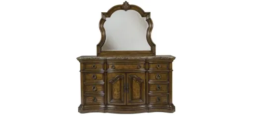 San Mateo Drawer Dresser Set Inspired by the sun-drenched warm days and cool nights of Northern California's wine country, the San Mateo collection embraces a relaxed sense of elegance. This collection feature soft lowing shapes with a rich finish. Elegantly molded framed doors, drawers, mirror frames and bed panels express the romance and charm of an Italian influenced villa. The dresser offers plenty of storage with nine drawers and three tray drawers behind two doors. The laminate marble top adds a mix of materials and touch of luxury.