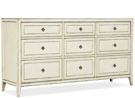 Just add candlelight. With clean lines and a creamy white finish accented with champagne and silver tipping, the Sanctuary Dresser is refined elegance with a whisper of Hollywood glamour. As practical as it is pretty, the nine-drawer dresser has a top center drawer with a drop front and a right top drawer with a drop-in felt-lined jewelry tray. The bottom 3 drawers are cedar-lined, and the top 3 drawers are lined with gray and white designer wallpaper.