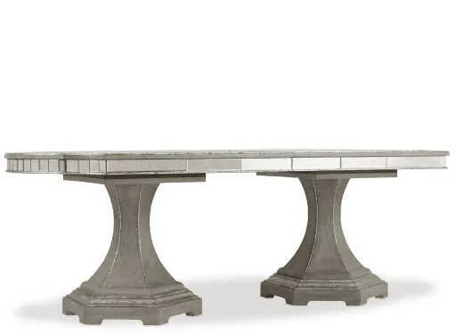 Make every dining gathering a luxe experience with this opulent Sanctuary rectangle dining table with two leaves featuring exquisite scrolled inlays on the top and a mirrored apron. Finished with shimmer on veneers and mirrored accents. Seats 10 guests and extends to 128 inches with both leaves in place.