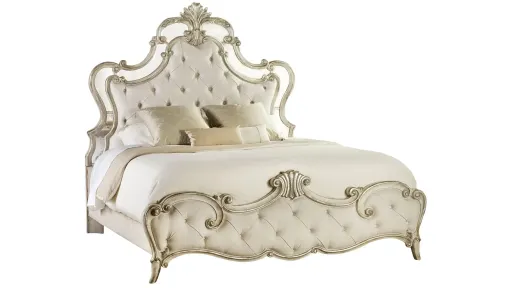 This Sanctuary king upholstered bed sparkles stylishly in this elegant finish, with a slightly aged patina and with a border of antique mirror. Dream happily-ever-after in a fairy-tale bed you've aspired to all your life. The tufted upholstery adds softness as the perfect finishing touch. Pursue serenity at home. Create your own personal sanctuary, a special place where you can experience comfort within.