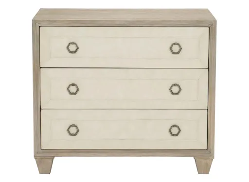 The Santa Barbara Night Stand features a Sandstone finish and three drawers with raised drawer fronts wrapped in performance fabric with double-needle stitching. It has a tapered foot and adjustable glides.