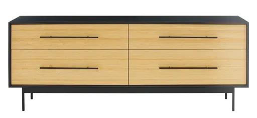 Create a casual and sophisticated look with Santa Cruz Double Dresser. The sleek modern design and simple clean lines of the four drawer Santa Cruz double dresser features a craftsman-built frame made from solid bamboo, lacquered in a matte black finish on a strong steel base. Black steel accents complement Wheat bamboo drawers and black lacquer surfaces. Four wide solid bamboo drawers are built using English dovetail joinery and uses under-mounted, soft-close glides for easy opening and closing. Each drawer is faced in Wheat solid bamboo material, with a drawer box of warm caramelized solid bamboo, and accented with a slim black steel drawer pull. Environmentally safe, Wheat is not a surface stain, the color is the result of an innovative caramelization process using heat, steam, and pressure to transform the solid bamboo material into Wheat's light color.