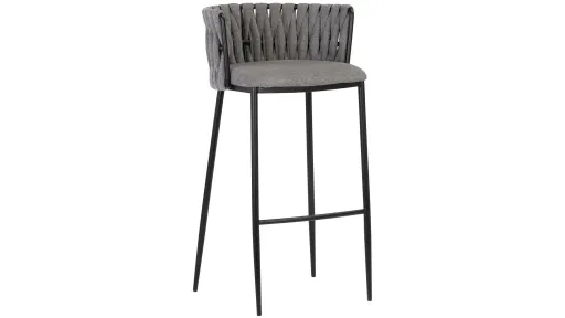 Sarai Barstool features an eye-catching design that will bring drama to any space. Crafted with a unique weaved backrest that is upholstered in our belfast heather Gray and koala Gray fabrics. Completed with black powder coated steel frame in a smooth finish.