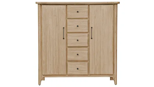 Expertly crafted from Indonesian Mindi wood, the Savannah Door Chest showcases the natural beauty of its fine grain and warm finish. Featuring five spacious center drawers flanked by dual side cabinets with adjustable shelves, it offers ample storage for clothing, linens, or everyday essentials—all wrapped in a sleek, minimalist design.
