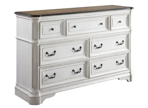 Add personality to your bedroom style and a feeling of coziness with this Seareach 7 Drawer Triple Dresser. Designed for you to stand in front of and get ready, this horizontal triple dresser has a convenient and wide top area for your getting ready needs and supplies. Loaded with capacity, this piece is equipped with seven easy open drawers for practical and good looking clothing storage. This dresser is built to last from high quality solid wood.