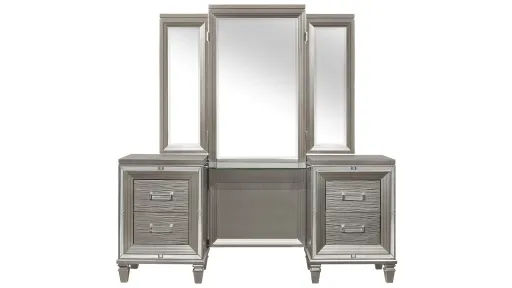 Designed to help your bedroom reach its full glamorous potential, the Selena vanity unique attributes blend to create a stylish and functional addition to your lifestyle. Mirrored framing provides dramatic enhancement to the vanity, illuminating the silver-gray finish. Acrylic hardware provides unobtrusive decorative touch to the drawer fronts of the vanity while the tri-panel mirror is paired with drawer storage creates the perfect platform to prepare your glamorous self. Jewelry hooks are mounted discretely behind the side mirror panels.