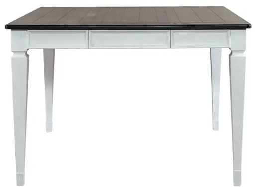 Shelby Counter Height Table features a wire brushed white finish with charcoal tops, planked top, one 18" leaf to accommodate guests or a larger family with ease and is anchored by square turned legs, Crafted of poplar and rubberwood solids with pine veneers and cathedral white oak veneer top. This table is perfect for creating a classic look, while maintaining a casual feel.