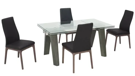 With 4 black cushioned chairs and a beautifully constructed glass top table, the Sombra 5-pc. Dining Set is bound to elevate your space. If you find yourself in need of more space at the table, the self- storing extension leaves give you endless options.
