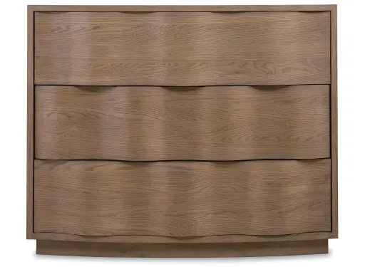 A stylistically versatile dresser blending natural textures with a light-and-airy modern aesthetic, the Sonnet Bachelors Chest has 3 push-open drawers with shaped-wave drawer fronts. Crafted of quartered and cathedral-cut white oak veneers, it has a light earthen-toned finish. The top drawer has a cream-colored removable drop-in left liner. The plinth base adds chic modern appeal.