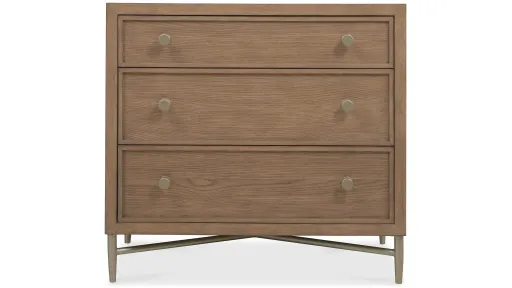 A stylistically versatile nightstand blending natural textures with a light-and-airy modern aesthetic, the Sonnet Three Drawer Nightstand has 3 self-closing drawers and a metal base, stretcher and tapered legs. Crafted of quartered and cathedral-cut white oak veneers in a light earthen-toned finish, the nightstand has a cord clip on the back and satin-finished champagne-colored knobs.