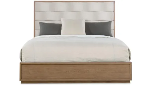Blending organic textures and neutral tones, the stylistically versatile Sonnet Upholstered Bed features a serene wave-shaped motif on the upholstered headboard. The bed frame and plinth base is crafted of quartered and cathedral-cut white oak veneers in a light earthen-toned finish. The savile oatmeal fabric is a polyester-linen blend with a two-tone striation. Includes headboard, footboard and rails.