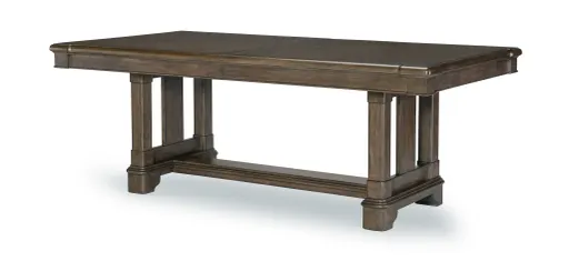 The Stafford Trestle 9-pc. Dining Set offers plenty of creative storage without sacrificing a warm, traditional style. This table comfortably accommodates 6, or use the included 18" leaf and host lively dinner parties of 8. The rustic cherry finish has wormholes, slight distressing, heavy grain patterns, and a dry tone that creates a relaxed palette sure to compliment any dining room dcor. Metal to metal bolt construction provides strength and durability, so you can dine in for years to come.
