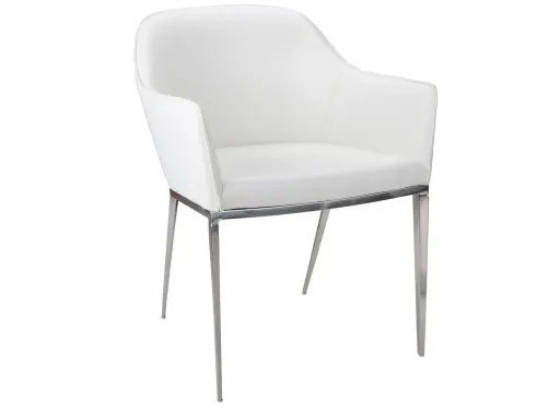 Stanis Dining Armchair is a mix of modern, urban design, and can be used as either a dining or occasional chair. Stocked in white and grey faux leather with polished steel legs. Handle With Care: This design has been crafted with faux leather. Faux leather is manufactured to reflect the natural characteristics of leather; as such, colour variations, markings, wrinkles, grooves, and light scratches are appreciated characteristics.