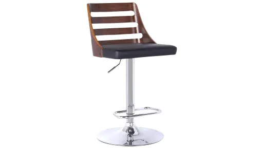 This Storm adjustable-height swivel bar stool is designed with a sturdy footrest and adjustable lever to comfortably select your desired height. This piece has a uniquely designed backrest that provides a Mid-Century feel with a comfortable seating area. The chrome finish gives a fresh look to complement your existing decor, and the seat adjusts with a gas-lift mechanism in a chrome finish with walnut wood and black leather-look upholstery.