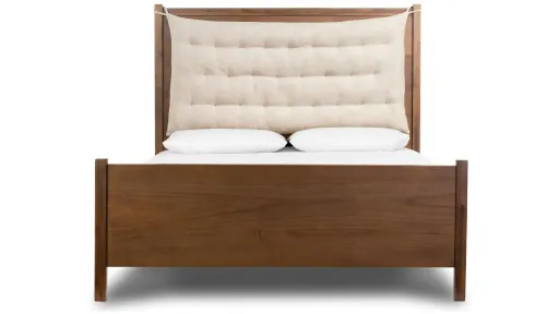 Sullivan Bed is simple, heavy wood bed frame with a removable sling cushion in a neutral fabric with blind button tufting. Choose the all-wood look or opt for a softer look with the pillow. The cushion is reinforced at the corners for added durability and easily removed for cleaning.
