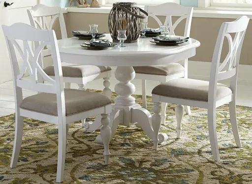 Summer House Casual Dining set is a coastal piece that gives an antique hue. Its oval table top with the traditional pedestal base acts as a centerpiece in your farmhouse-themed house. The chair features a coastal design on the back with the most comfortable seating.