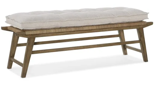 A medley of natural materials with a vintage farmhouse appeal, the Sundance Bed Bench is crafted of wood with a woven rope seat and loose fabric seat cushion covered in the Zuri Cream performance fabric for carefree maintenance. The rich finish is Cliffside, a dynamic brown with light burnishing on the edges.