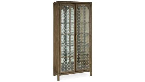 Create a calming resort-inspired retreat in your home with the focal-point-worthy Sundance Display Cabinet. The circular patterned metal fretwork over tempered glass on the door fronts is a designer detail, along with an antique mirror back panel. Behind the doors are 4 adjustable wood-framed glass shelves illuminated by a 3-intensity touch switch. Crafted of Pecan Veneers, the cabinet is finished in Cliffside, a rich, dynamic brown finish with light burnishing on the edges.