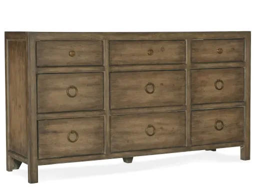 Inspired by the rugged, earthy and picturesque Malibu landscape, the Sundance Nine-Drawer Dresser offers a simple yet stylish silhouette crafted of Pecan Veneers and finished in the rich brown Cliffside finish with light burnishing on the edges. Featuring nine self-closing drawers, the top left and top center drawers have removeable felt liners and the top right drawer has a removable felt jewelry tray. The 3 bottom drawers are cedar-lined.