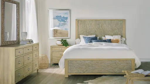 Inspired by the iconic Pacific Coast Highway, the striking Sundance Panel Bedroom Set has a laid-back beachy vibe with its reeded diamond motif on the headboard and footboard in the natural finish. Includes headboard and footboard and rails. Headboard can be used alone.