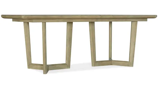 Inspired by the laid-back California coast, the Surfrider Rectangular Dining Table combines a Solid Wood-edge top crafted of Pecan Veneers with an airy double base. Finished in the light natural Driftwood finish, the table offers two 18-inch leaves, extending the table to 118 inches, accommodating 2 arm chairs and 6 side chairs with the leaf included.