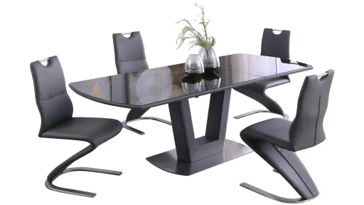 This Surie dining set features a butterfly-extendable table with a tempered glass top on an brushed stainless steel open-pedestal base. The handle-back dining chairs features quality faux leather and a unique U shaped based with a brushed nickel finish.