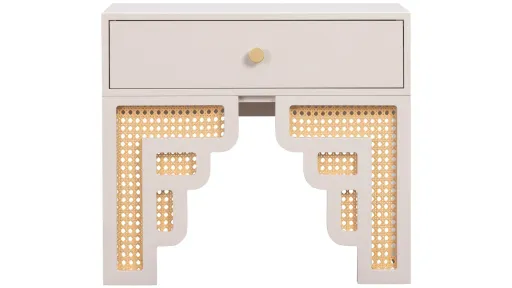 Inspired by the Art Moderne style, the Suzie Nightstand alludes to Palm Springs' art-deco design through its bold colors and curvaceous form. This wooden nightstand features a soft close drawer for practicality; while its rounded edges and woven rattan details add a playful twist. The Suzie will cement itself as the perfect balance between contemporary living with a touch of glamour in your space!