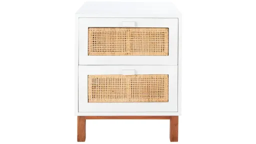 Oceanside ambiance comes to bedroom decor in this Tegan Nightstand. Tegan's decor smart juxtaposition of white wood with natural finished legs and matching rattan accents makes it an icon of design fusion, while its two drawers provide ample bedside storage.