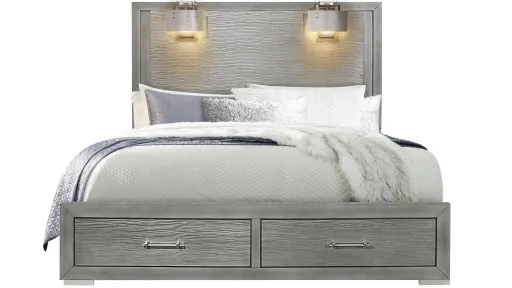 The Tiffany Bed is highlighted with acrylic hardware, chrome feet, footboard storage and headboard lamps. The Silver finish wraps it all up together. The lamp lights on the headboard and the LED lights on the mirror (sold seperately) accent the overall design. With this set, you achieve maximum storage and maximum style.
