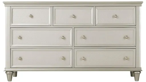 Make your bedroom look impeccably glamorous with the Tiffany Bedroom Dresser. Its Hollywood-inspired design is truly dazzling with its polished nickel hardware and stunning silver finish. Plus, faux snakeskin accents adorn the drawer fronts for even more chic flair.