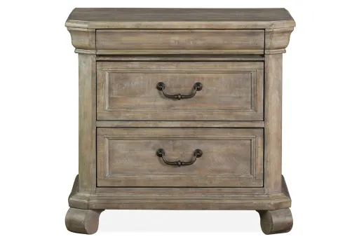 Tinley Park Nightstand welcomes with European inspired styling in a Dove Tail Grey finish and Weathered Bronze hardware. Elegant scroll work adorns select case pieces while roomy dressers and chests feature rounded corners atop rounded bun feet. Allow Tinley Park to create a warm and inviting Chateau feel within your home.