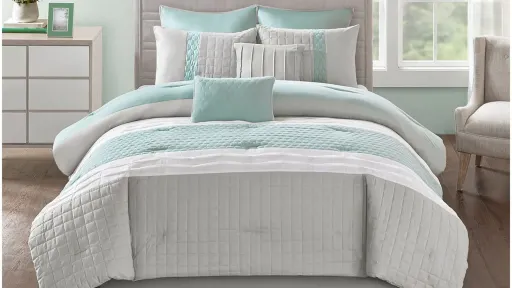 Add a refreshing new look to your bedroom with the Tinsley 8-pc. queen comforter set. Made from ultra-soft microfiber, the seafoam and gray comforter flaunts a piece design with pleated accents that add dimension and charm. Quilting and pintuck details create a beautiful textural look and feel, while a solid gray reverse complements the top of the bed. The coordinating shams reflect the design of the comforter and seafoam Euro shams with gray flanges complete the chic ensemble. Also included are two Decorative pillows and a solid gray bed skirt that provide the perfect finishes for the bedding set. Machine washable for easy care, this comforter set is sure to brighten up your bedroom decor.