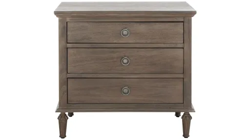 Emanating timeless French elegance, this Tomi Nightstand is a must-have for today's classic-contemporary decor. Tomi's turned and fluted legs flaunt subtle Rococo details that flourish in light brown mahogany, pairing perfectly with the antiqued silver ring pulls on its three drawer.