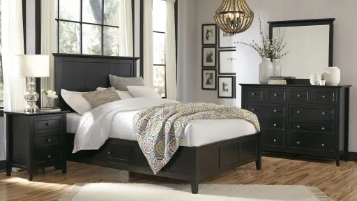Get a fresh take on classic Shaker style with the Tompkins 4-pc. California king storage bedroom set. This set features a simple, framed panel design with reverse bevel floating tops. Casegoods rest atop tapered legs with a gently arched lower side cross. The storage bed includes 2 drawers on each side and ships with a platform bed slat kit designed for use without a foundation. As with any classic shaker design, Tompkins's beauty is in its function and ease. Casegoods feature sanded and stained plywood drawer boxes with front and rear English dovetail joinery and full-extension ball bearing drawer glides. Dresser and chest top drawers are felt-lined for storing delicate items. Bed features hook-on rail fittings for long-term durability.
