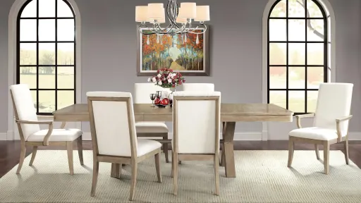 Torrin 7-pc. dining set with upholstered chairs is organic and contemporary with a touch of glamour. Clean lines and soft rounded corners give this set a light and airy feel. Constructed of wire-brushed oak veneers in a natural finish.