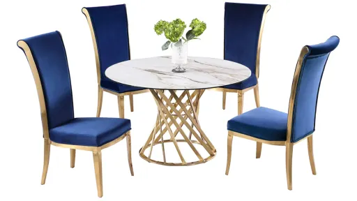 Tracy Dining Set features a round marbleized sintered stone top with matte beige coloring sitting gracefully on an artfully designed stainless steel base in a brushed brass finish. Upholstered in plush blue fabric and resting on contrasting brushed brass stainless steel legs, the dining chair provides a perfect match for the set.